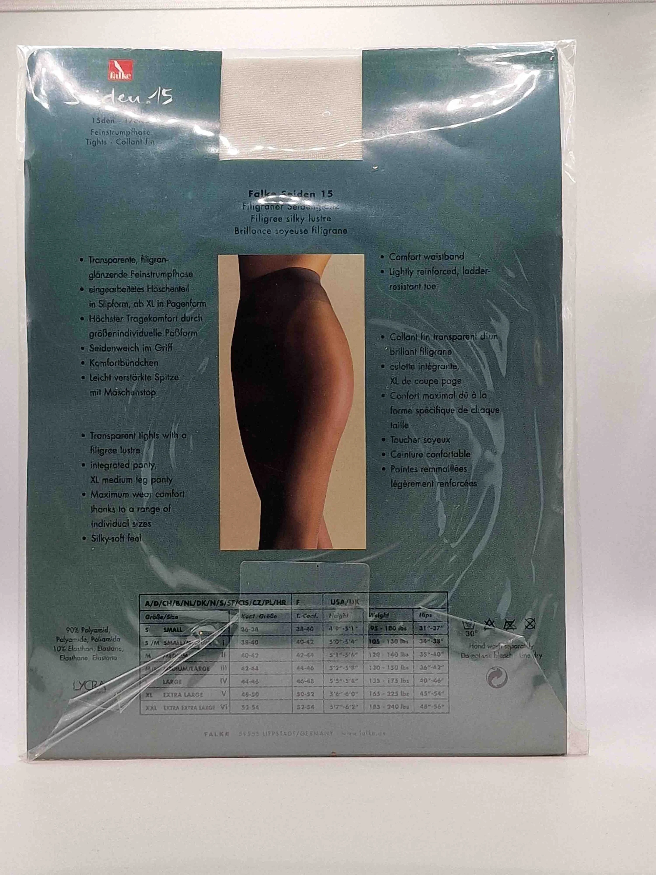 Waschbar bei 30°C, Material 90% Polyamid, 10% Elastan. 15 den.